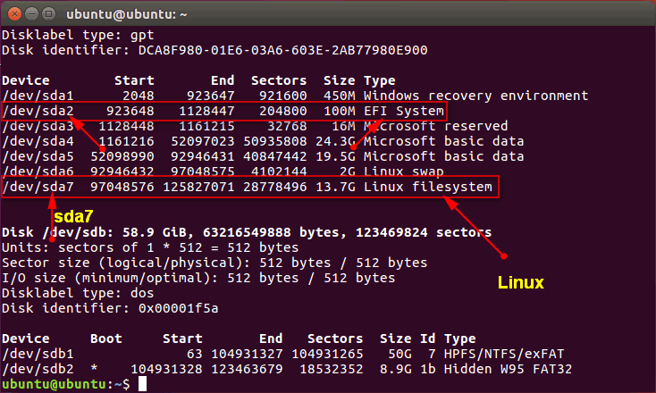 Ubuntu partition: Look for a partition with the “Linux” type. This is where your Ubuntu system is installed. Note down its name, which will look something like /dev/nvme0n1p6.